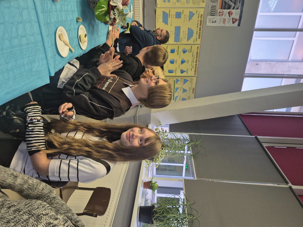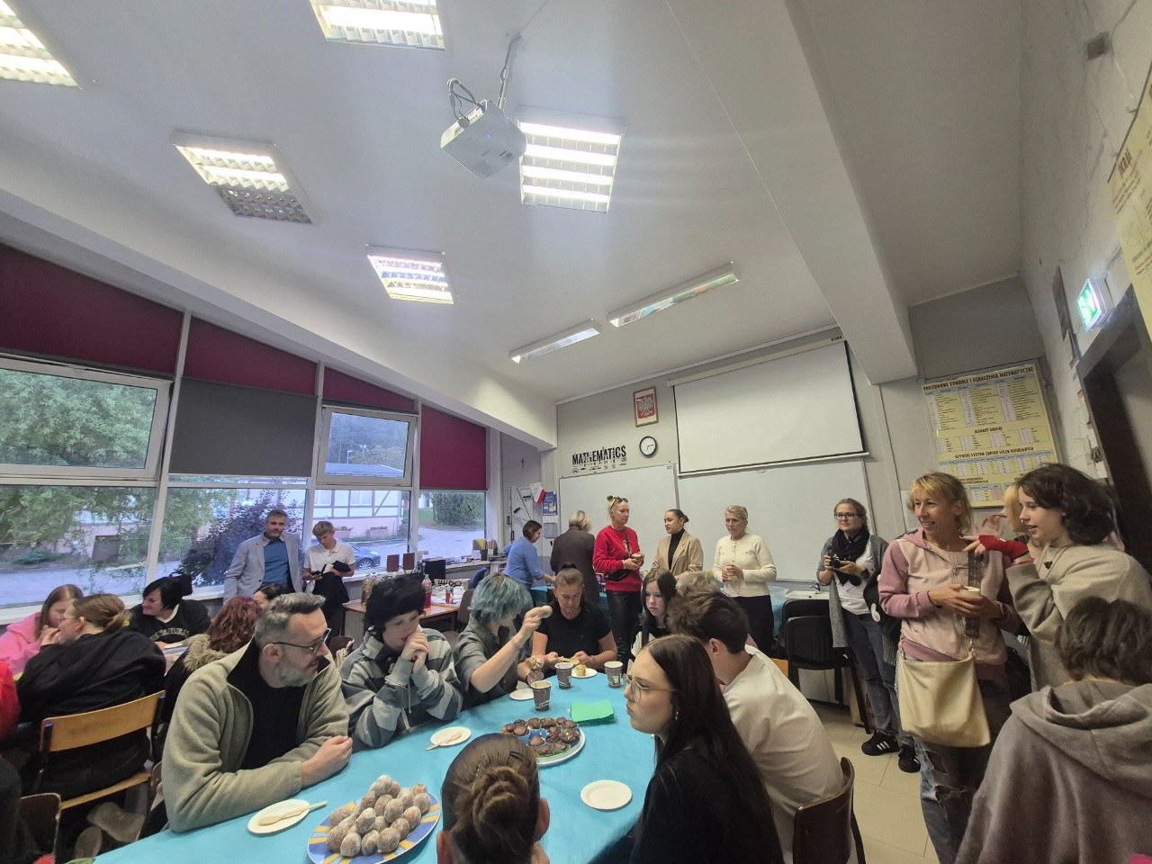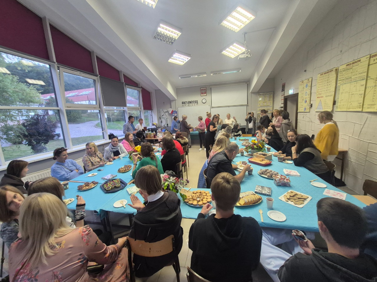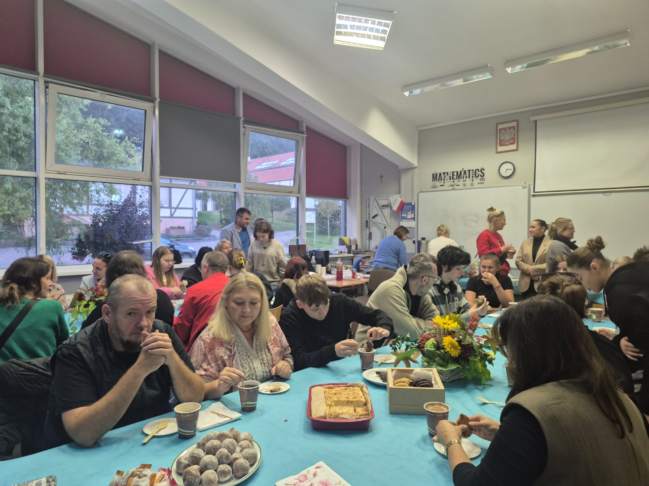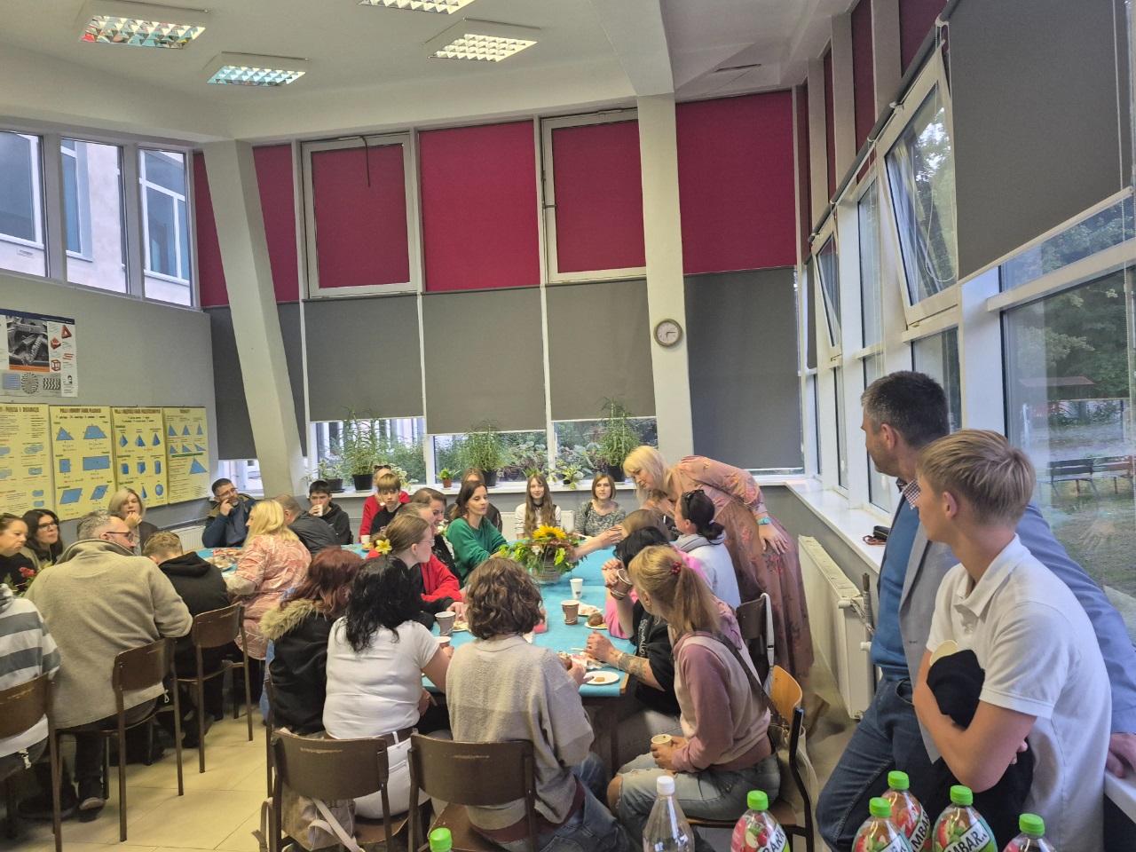 Po części artystycznej chwile głębokiej refleksji zapewnił nam film "Uwięziony" - zwycięzca powiatowego konkursu na film profilaktyczny "Stop przemocy rówieśniczej. Stop agresji wobec innych" stworzony przez Zespół Szkół Ponadpodstawowych im. Tadeusza Kościuszki w Sobolewie. Film był o tym, do czego może doprowadzić nękanie przez rówieśników. Następnie głos zabrała p. Dyrektor, która zapewniła zgromadzonych o wsparciu ze strony szkoły w ewentualnych trudnych chwilach oraz zaprosiła wszystkich na słodko-kawowo-herbaciany poczęstunek zapewniony przez Rodziców naszych Uczniów. Reszta czasu zeszła nam na miłych pogaduszkach, dzięki którym wszyscy mogli bliżej się poznać i zacząć budować głębsze relacje.