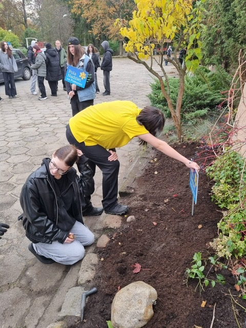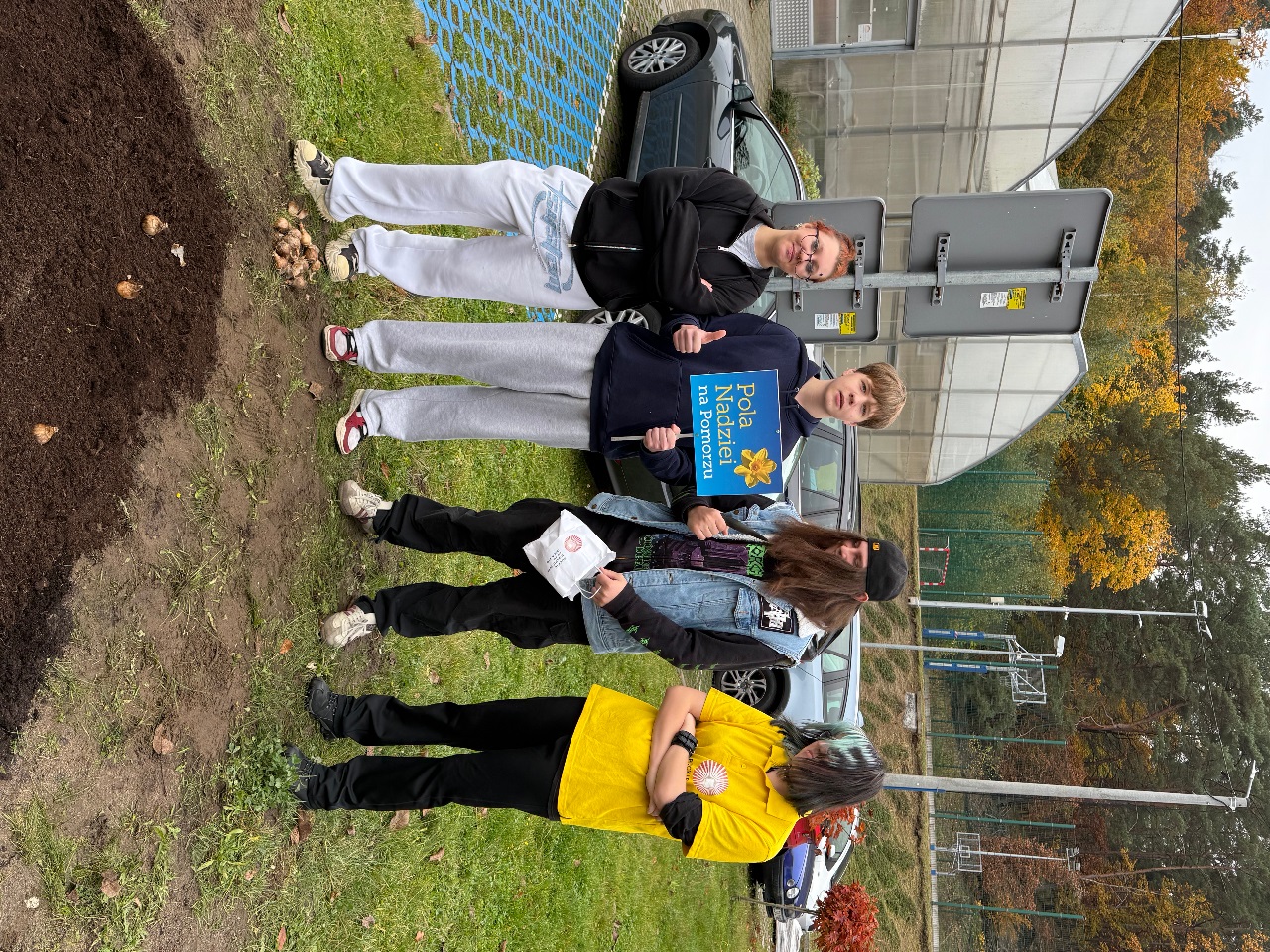 We czwartek 30 października 2025 r. wspólnie z pomorskimi hospicjami symbolicznie rozpoczęliśmy kolejną edycję Pól Nadziei na Pomorzu. Pod opieką pani kierownik Idy Modrzyk i pani Agnieszki Glińska-Romer uczniowie klasy 2AK zasadzili żonkile, które zakwitną na wiosnę. Żonkil to międzynarodowy symbol nadziei na nowe życie, odrodzenie i zwycięstwo nad chorobą. Sadzenie żonkili staje się symbolicznym aktem solidarności z osobami objętymi opieką hospicyjną, przypominając o tym, że nie są one same. Akcja Pola Nadziei łączy symboliczny akt sadzenia żonkili-jesienią, a wiosenną zbiórką funduszy, podczas której wolontariusze wręczają żonkile darczyńcom. Całość ma na celu zwrócenie uwagi na ideę opieki hospicyjnej oraz zebranie środków na jej wsparcie.